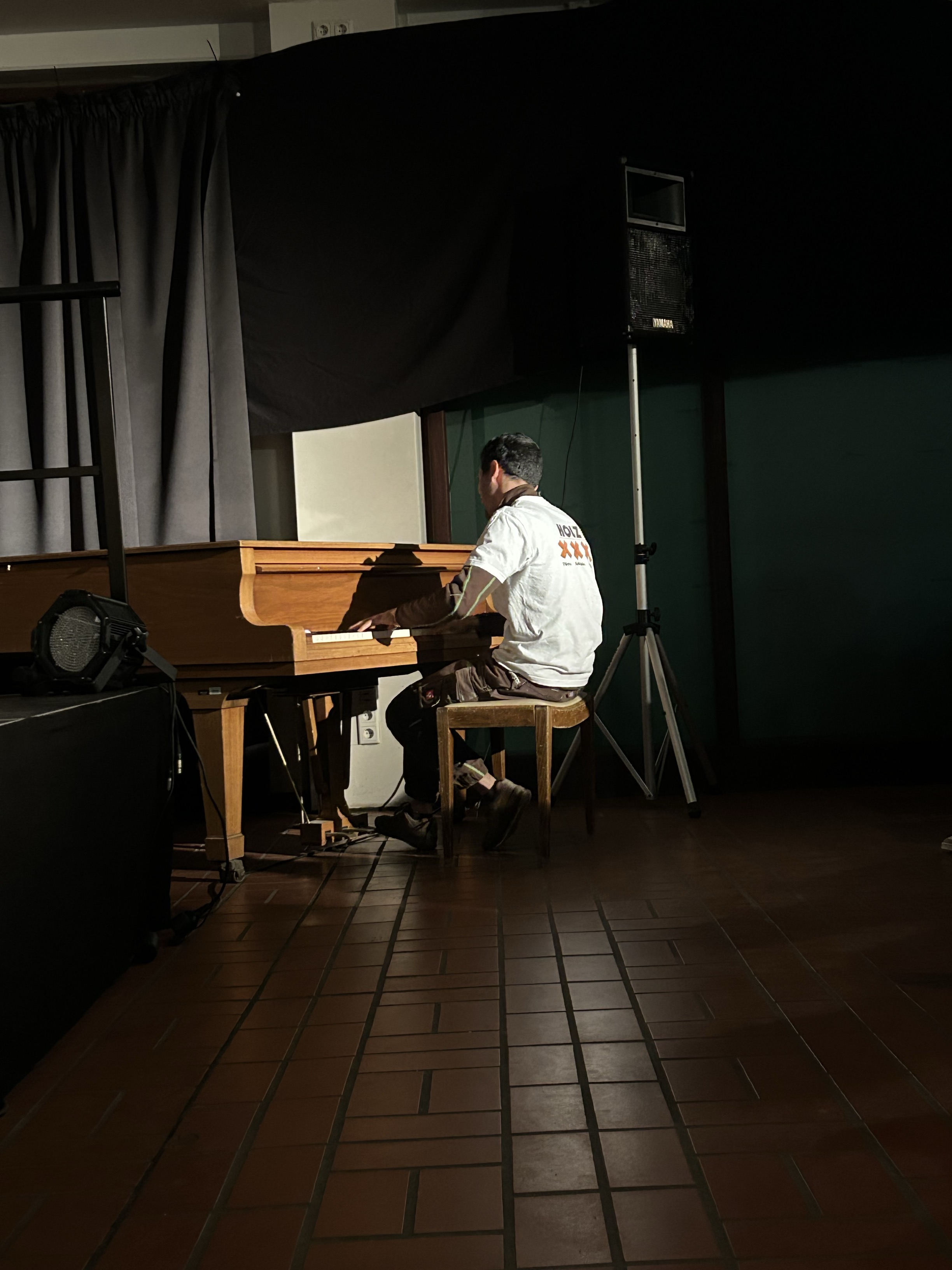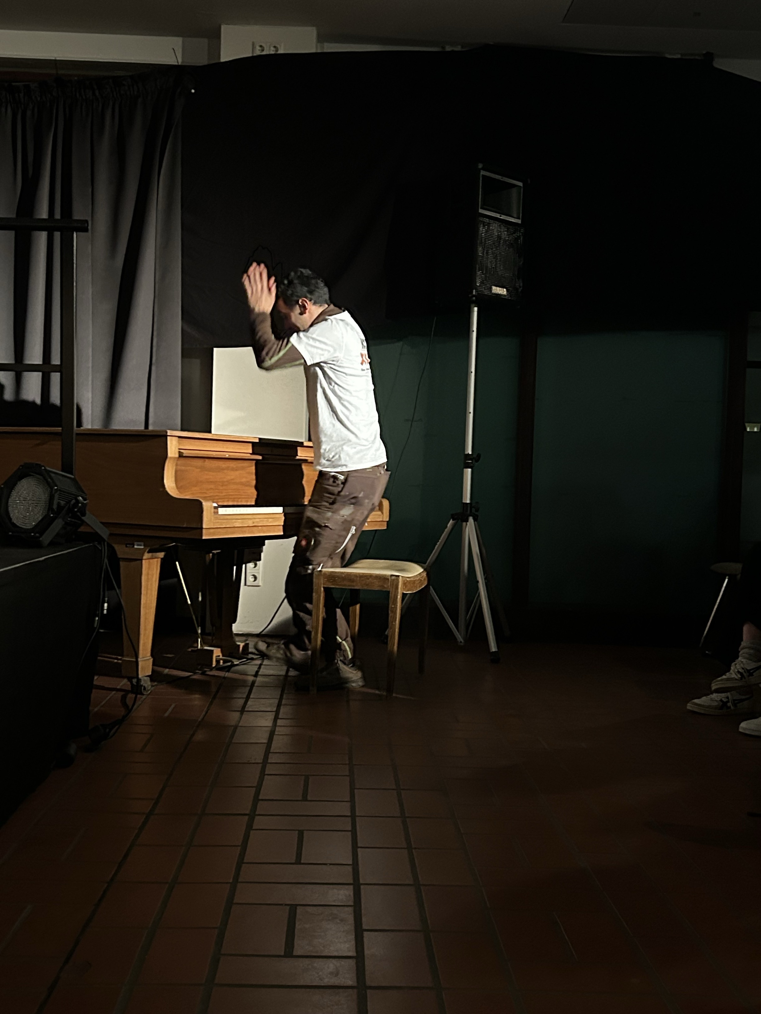 Martin Bretschneider, der das Stück im Interkulturellen Zentrum Hövelriege produzierte, verarbeitete beim Schreiben die Situation, dass Ahmad zur Probenzeit als Tischler arbeitete. „Das war eine harte Zeit für Aeham, der oft bis zu 10 Stunden auf Baustellen unterwegs war und dann am Wochenende noch Konzerte spielen musste. Er riskierte dabei natürlich auch die Gesundheit seiner Finger.“ sagt Bretschneider. „Seine Energie, die man bei jedem Auftritt auf der Bühne spürt, ist einfach unglaublich“. Martin Bretschneider war als Schauspieler unter anderem am Schauspielhaus Graz, am Theater in der Josefstadt Wien und am Bochumer Schauspielhaus engagiert. In Sönke Wortmanns Wunder von Bern verkörperte er den Kölner Fußballweltmeister Hans Schäfer und ist im TV in zahlreichen Produktionen zu sehen. In den letzten vier Jahren spielte er in der ZDF-Krimiserie Blutige Anfänger den Gerichtsmediziner Claas Steinebach.