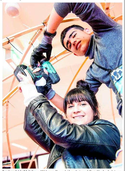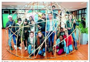 Herford. Teile alter Lattenroste, Stoffe, die das geodätische Gestell zum Teil abdecken, und alte, glitzernde CDs als blinkende Hingucker sind die Materialien aus denen die Schüler dreier Integrationsklassen am Anna-Siemsen-Berufskolleg (ASB) einen "Kokon" im Schulfoyer errichten.