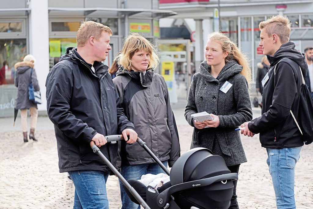 Neben dem ASB zeigten gestern die drei Gymnasien, die Barlach- sowie die Scholl-Realschule und die Gesamtschule Friedenstal Flagge auf dem Alten Markt. Sie alle tragen das Siegel »Schule ohne Rassismus – Schule mit Courage«. »In Herford leben mehr als 100 Nationen. Wir wollen eine Stadt sein, in der Rassismus keine Chance hat und die im Zeichen von Toleranz und Vielfalt steht«, sagt Mitorganisatorin Jeannette Bieber (16) vom RGH. Den etwa 40 Jugendlichen war es ein Anliegen aufzuklären und mit Passanten ins Gespräch zu kommen. Am ASB-Stand konnte man beim Dosenwerfen menschenverachtende Einstellungen wie Diskriminierung, Homophobie, Hass, Salafismus und Co. mit einem Ball zu Fall bringen. KMG-Gymnasiasten machten in der Fußgängerzone den Faktencheck und fragten: »Wie viele Flüchtlinge nahm Deutschland 2016 auf?« Antwort: 305 000! »Viele waren der Meinung, es seien deutlich mehr gewesen«, sagt Thomas Koch (15).