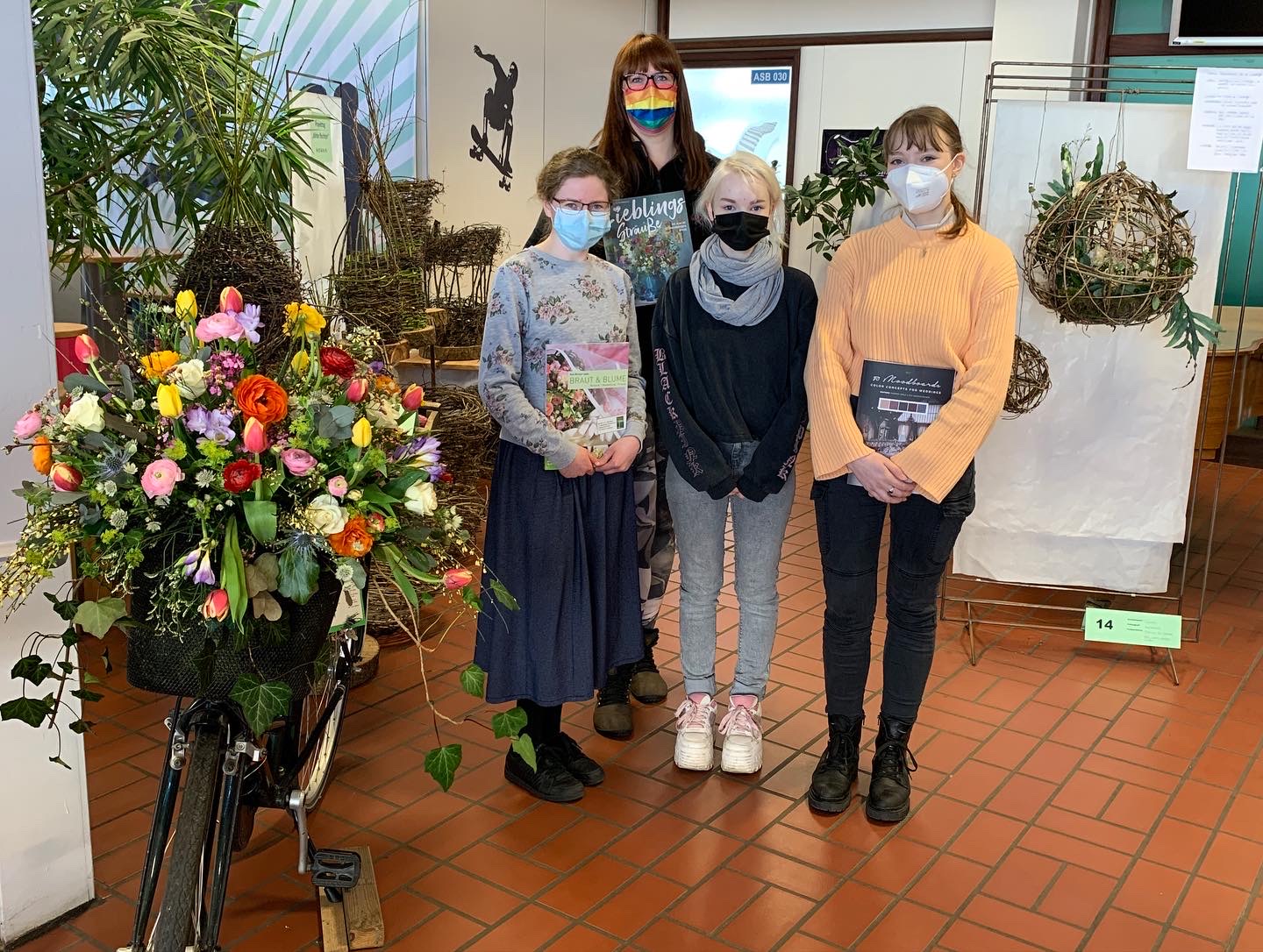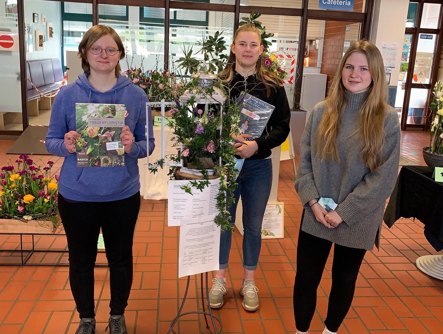 Die Gestecke wurden anschließend in einer Ausstellung im Foyer des Anna-Siemsen-Berufskollgs präsentiert und von einer Fachjury aus Floristikmeisterinnen gemäß der Prüfungskriterien bewertet. Darüber hinaus hatten alle Schülerinnen und Schüler des Anna-Siemsen-Berufskollegs die Möglichkeit, ihren Favoriten unter den Gestecken zu wählen.