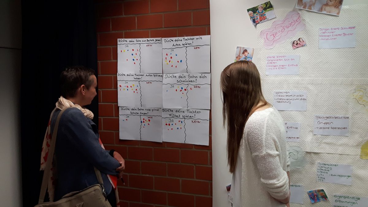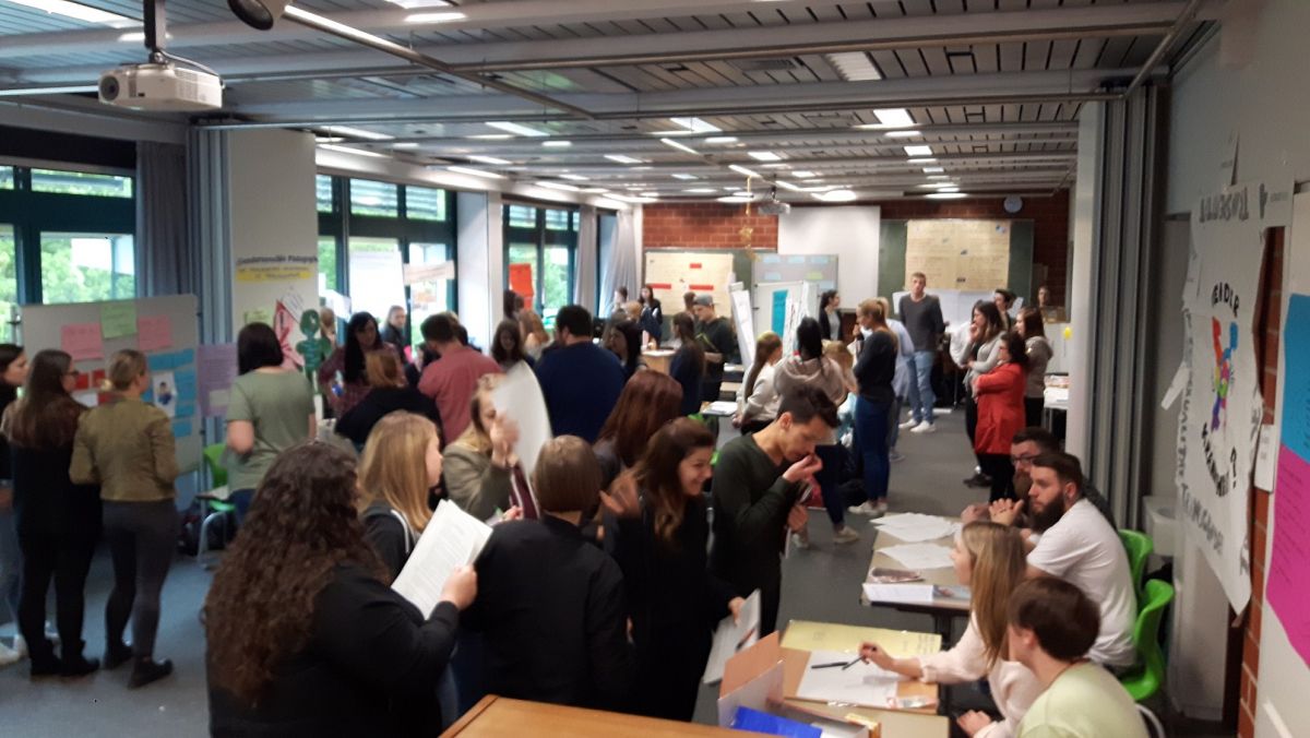 Gendersensible Pädagogik: ein Fachbegriff, mit dem die Wenigsten etwas anfangen können. Die Unterstufen der Fachschule für Sozialpädagogik, FSP71 und FSP72, haben sich in den letzten Wochen im Unterricht im Lernfeld „Lebenswelten und Diversität wahrnehmen, verstehen und Inklusion fördern“ intensiv mit diesem Thema auseinandergesetzt. Zusätzlich haben die Klassen sich ausführlich mit LGBTI*-Themen im Rahmen eines Workshops des Projekts „SCHLAU e.V.“ aus Bielefeld (http://bielefeld.schlau.nrw) beschäftigt. Bei der gendersensiblen Pädagogik geht es im Wesentlichen darum, wie ein Mensch im Laufe seines Lebens seine geschlechtliche Identität und Orientierung findet und wie pädagogische Fachkräfte dabei individuell unterstützen können. Beide Klassen haben in Kleingruppen dieses komplexe Thema theoretisch bearbeitet, um es dann in kleinen Messeständen am 30.04.2018 den Oberstufen der Fachschule für Sozialpädagogik und den ERZ-Schüler*innen zu präsentieren. Schon in der Vorbereitung der Präsentationen waren unterschiedliche Ideen zu erkennen. So gab es Gruppen, die methodisch (Rate-)Spiele zu ihren Präsentationen anboten, andere gestalteten Plakate, welche so gestaltet waren, dass die Besucher*innen über dieses Thema nachdenken konnten; andere nutzten Pappkartons anstelle von Plakaten, um die Blicke der Besucher*innen zu erhaschen. Bereits vor dem Präsentationstag der Messestände wurden die Ergebnisse der Gruppenarbeiten klassenintern vorgestellt. So konnten alle einen vertieften Einblick in das Thema gewinnen und dazu beitragen, die Stände inhaltlich und optisch zu verbessern. Die Besucher*innen zeigten während der zwei Unterrichtsstunden ein hohes Interesse. So herrschte über den gesamten Zeitraum ein reger Austausch über das Thema der gendersensiblen Pädagogik. Für manche war ein erster Zugang zu diesem Thema wichtig, um zum Beispiel Fragen zu klären wie „Warum können Mädchen mit ‚Jungenspielzeug‘ spielen, aber Jungen oft nicht mit ‚Mädchenspielzeug‘?“ oder „Wie reagiere ich, wenn Mädchen oder Jungen den Wunsch äußern, das Geschlecht zu wechseln?“. Die Besucher*innen hatten auch die Möglichkeit, auf bereitgestellten Bögen ein Feedback zu den Ständen zu geben. Diese ergaben eine bemerkenswerte Anerkennung der präsentierten Stände. Dieses bestätigte die Schüler*innen der Unterstufe darin, dass sich die Arbeit gelohnt hat. Auch von den beiden Lehrkräften (Holwe und Reiners) gab es viele positive Rückmeldungen. So waren am Ende alle Beteiligten – Schüler*innen, Besucher*innen und Lehrkräfte – gut informiert und mit den Arbeitsergebnissen zufrieden.