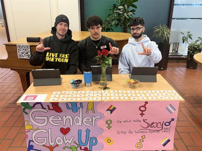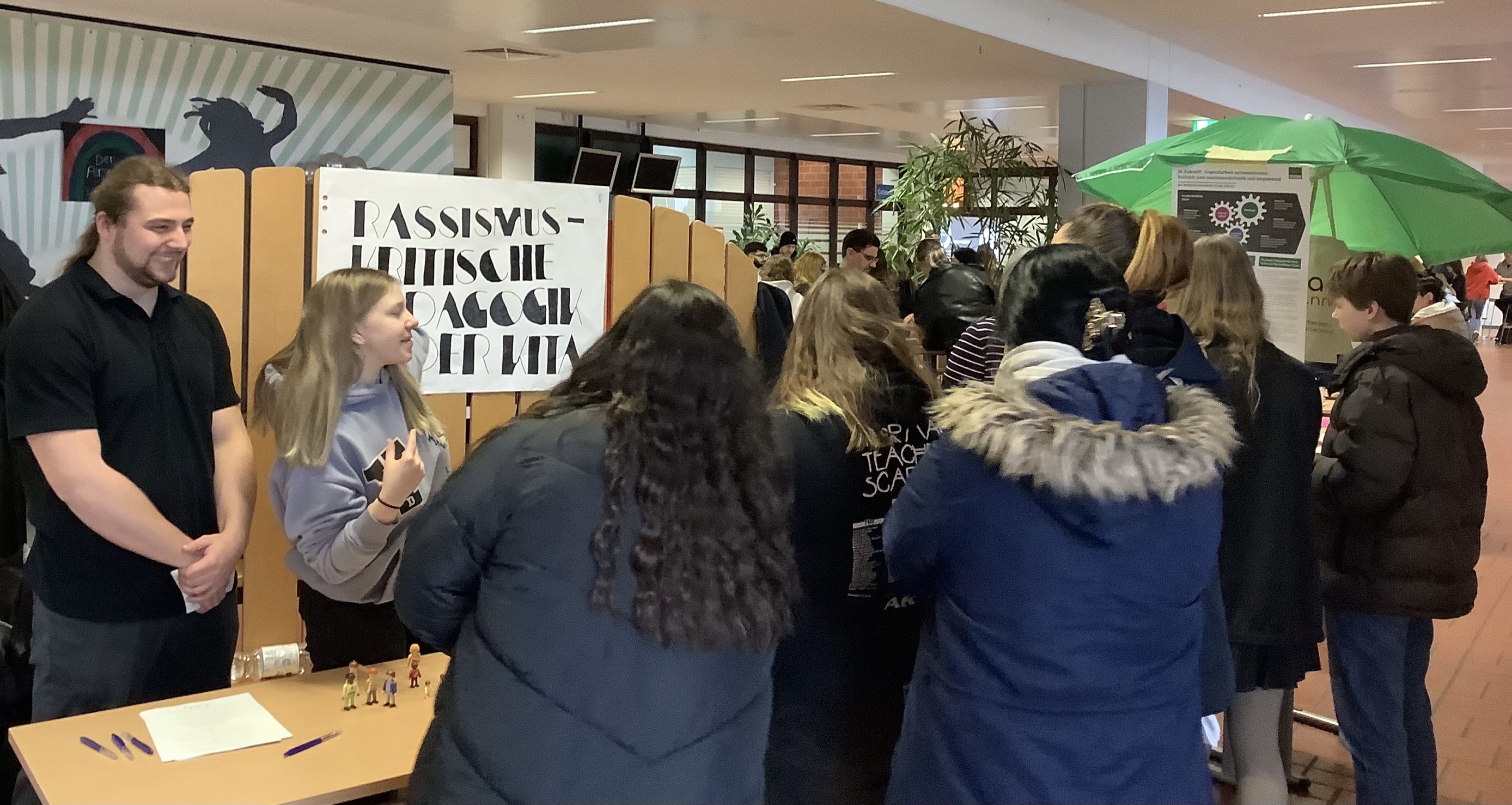 Zum gleichen Thema arbeiteten die Fachschüler:innen der Sozialpädagogik und verwandelten die Pausenhalle in eine Messe mit bunten Ständen zum Thema Diversität, geschlechtssensible und rassismuskritische Pädagogik, an denen sich alle informieren konnten.