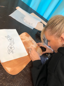 Auch am letzten Arbeitstag des Projekts herrscht rege Betriebsamkeit im Werkraum. Die Jugendlichen und jungen Erwachsenen bearbeiten zahlreiche Lederstücke an den verschiedenen Arbeitsplätzen. Auch eine Nähmaschine ist in Betrieb, um die Naht eines Gürtels sauber zu gestalten. Viel Handarbeit ist hier mit im Spiel: Sie glätten Kanten, färben Leder, bringen sogenannte Punzierungen auf. Dabei handelt es sich um eine Prägung des Leders mit einem Motiv oder Muster. Auch Taschen gestalten die Schüler in diversen Variationen, die sie mit Handnähten versehen.