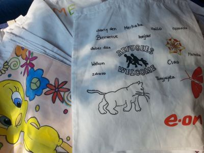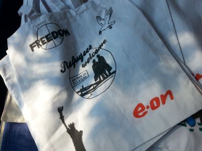 Die AG "Schule ohne Rassismus - Schule mit Courage" setzt sich aus SchülerInnen verschiedenster Bildungsgänge, verschiedenster Kulturen und Religionen zusammen. Allen gemeinsam ist, dass sie sich gegen jegliche Form von Extremismus und Diskrimierung aussprechen und aktiv einbringen möchten. Aus dem Besuch der Ausstellung "Flucht - Asyl ist Menschenrecht" ergab sich die Idee, sich auch für die Geflüchteten im Kreis Herford und darüber hinaus engagieren zu wollen. Dies geschieht aktuell durch das Bemalen von Jutetaschen, die der ASTA der Uni Bielefeld und die Mutter einer Schülerin spendeten. Diese "Willkommenstaschen" werden mit kleinen Spielzeugen, Büchern und Süßkrams gefüllt und dann im Rahmen kleiner Spielaktionen an und in den verschiedenen Unterkünften an die geflüchteten Kinder verteilt.