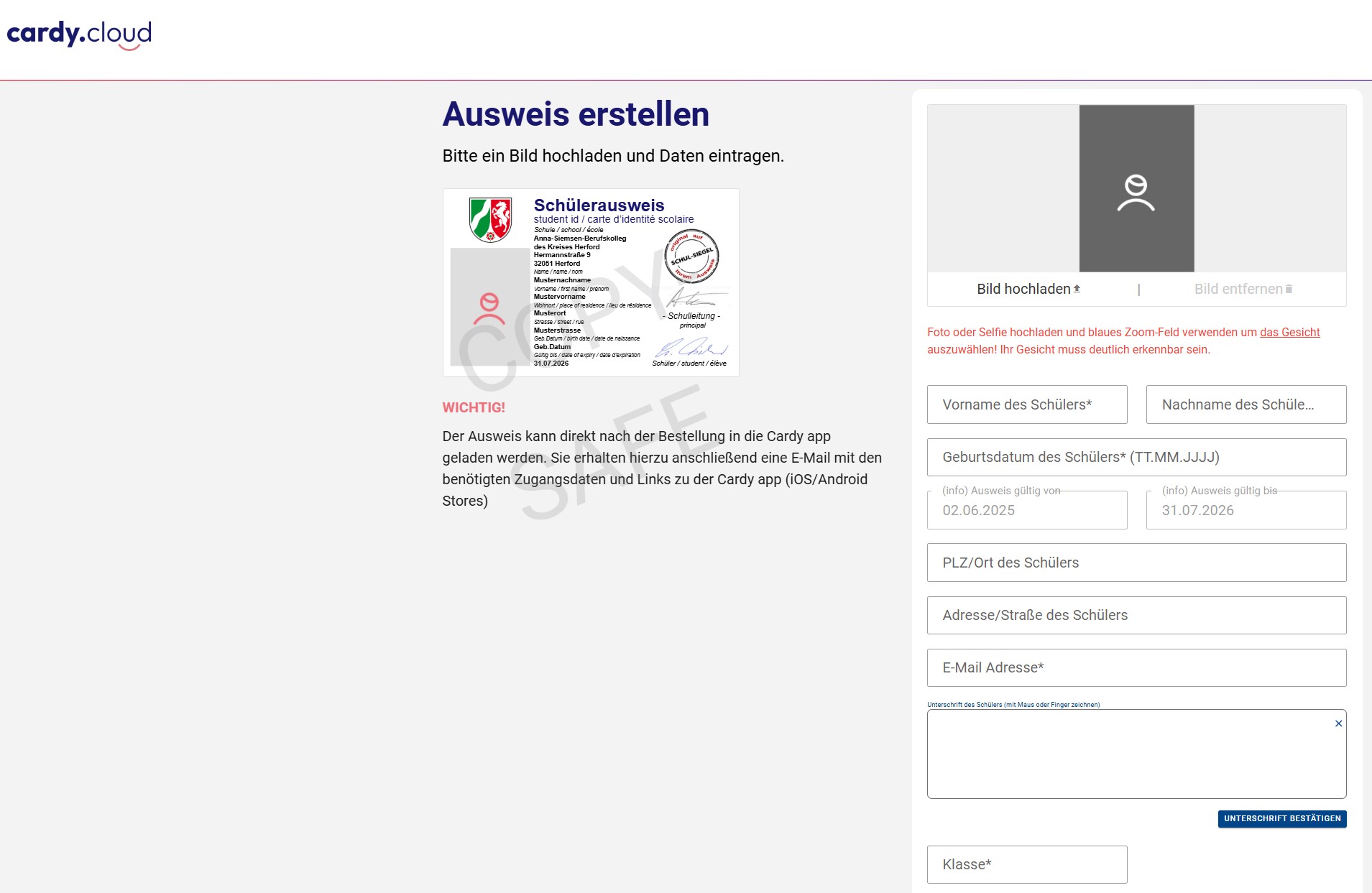 Schüler:innen müssen den digitalen Schülerausweis selbstständig online erstellen und sind somit für die Richtigkeit selbst verantwortlich und haftbar. Über den folgenden Link kann der Ausweis erstellt werden: https://cardy.cloud/s/asbk.de/nrw