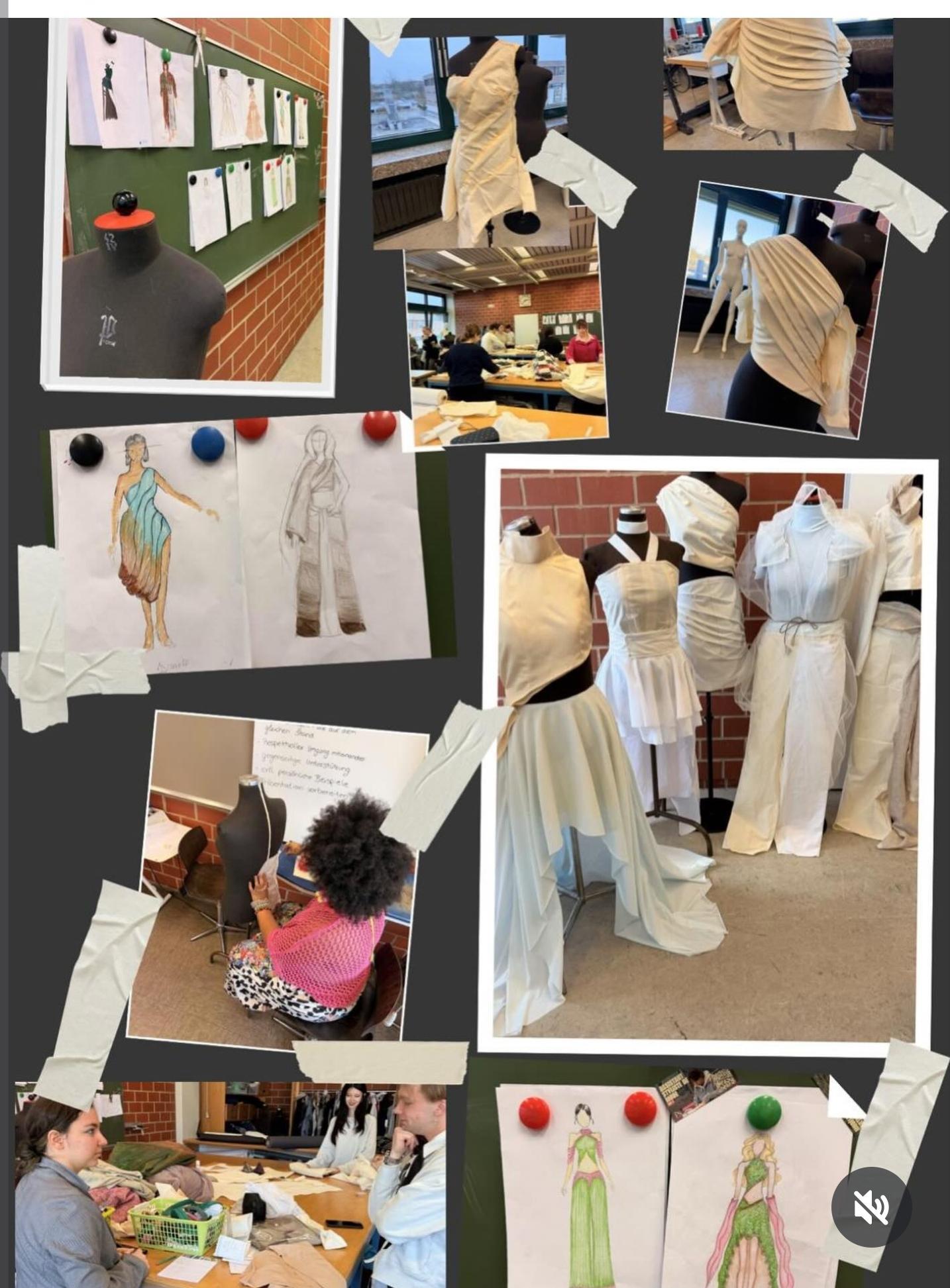 Im Mittelpunkt stand die gemeinsame Kollektion „Living in the Future Together“. Von der ersten Skizze über Materialauswahl und Schnittentwicklung bis hin zum finalen Nähprozess – alles entstand in international gemischten Teams. Die Schülerinnen beschäftigten sich dabei intensiv mit Fragen zum zukünftigen Leben: Wie prägt der Klimawandel unser Leben von morgen? Welche Spuren hinterlassen Konflikte und kriegerische Auseinandersetzungen? Wie gestaltet sich eine Übergangszeit, in der wir Lösungen suchen und neue Wege gehen? Und wie kann am Ende wieder Frieden wachsen – symbolisiert durch florale, hoffnungsvolle Elemente? Die Kollektion wurde schließlich ein visueller Weg durch die Herausforderungen und Hoffnungen der Zukunft: düstere, kraftvolle Entwürfe zu Beginn, gefolgt von experimentellen Übergangslooks und finalen Outfits voller Leichtigkeit, Licht und organischer Formen.